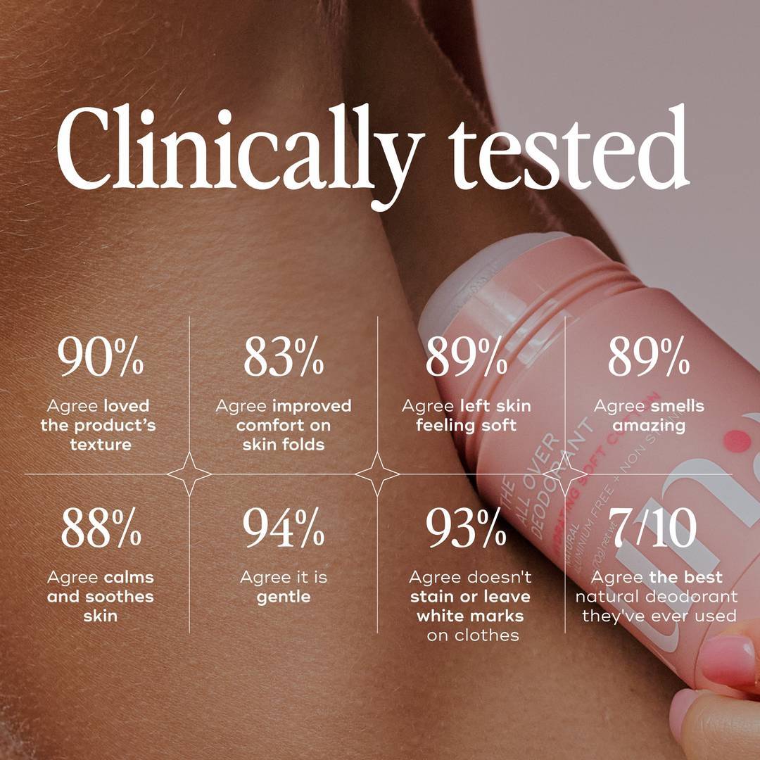 *Clinical user trial on 72 women of all ages, life stages and ethnicities, over three weeks including those who have sensitive skin and those who regularly use natural deodorant.